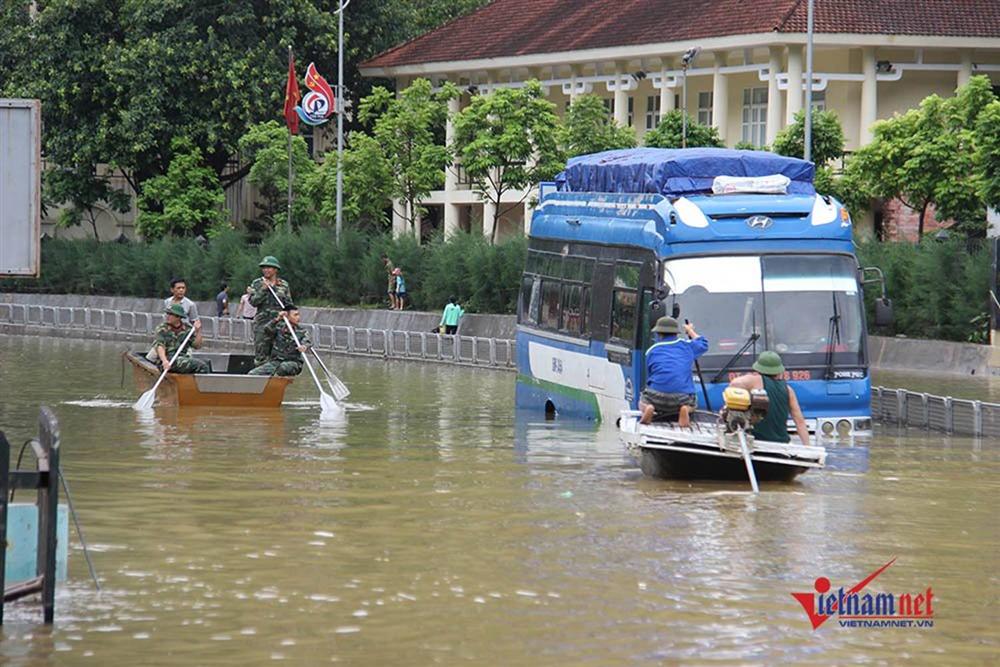Một xe chở khách bất chấp nước ngập sâu vẫn đi qua, nhưng khi đi tới khu vực sâu gần 2m thì đứng khựng lại, chết trân giữa dòng nước. Hành khách được đưa ra ngoài và trung chuyển bằng xuồng phao của lực lượng chức năng.