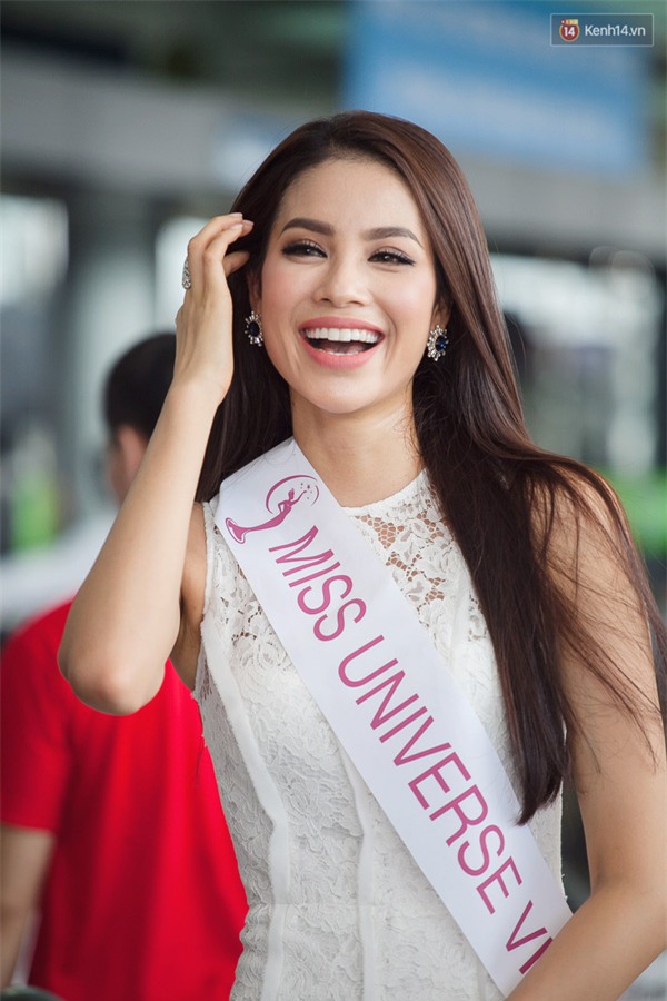 Vẫn phong cách thời trang giản dị tinh tế, Phạm Hương diện đầm trắng cùng giày cao gót đen với mãi tóc xõa bồng bềnh. Phạm Hương hôn tạm biệt mẹ và chào tạm biệt đàn chị Dương Trương Thiên Lý cùng các fan để chuẩn bị bước vào cuộc thi sắc đẹp tầm cỡ quốc tế.