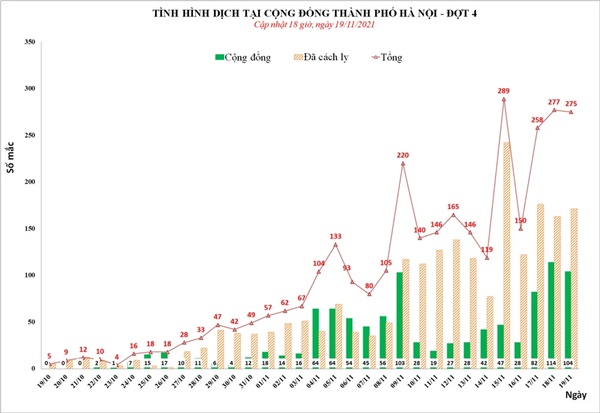 Ngày 19/11, Trung tâm kiểm soát bệnh tật (CDC) Hà Nội cho biết, trong ngày, thành phố phát hiện thêm 275 ca mắc Covid-19, trong đó, 104 ca cộng đồng, 135 ca ở khu cách ly và 36 ca ở khu phong tỏa.
