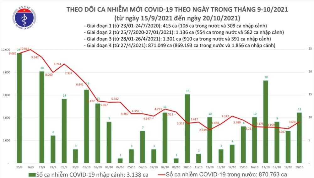 - Tính từ 17h ngày 19/10 đến 17h ngày 20/10, trên Hệ thống Quốc gia quản lý ca bệnh COVID-19 ghi nhận 3.646 ca nhiễm mới, trong đó 11 ca nhập cảnh và 3.635 ca ghi nhận trong nước (tăng 608 ca so với ngày trước đó) tại 50 tỉnh, thành phố (có 1.810 ca trong cộng đồng).