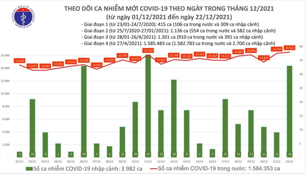 - Tính từ 16h ngày 21/12 đến 16h ngày 22/12, trên Hệ thống Quốc gia quản lý ca bệnh COVID-19 ghi nhận 16.555 ca nhiễm mới, trong đó 33 ca nhập cảnh và 16.522 ca ghi nhận trong nước (tăng 206 ca so với ngày trước đó) tại 60 tỉnh, thành phố (có 10.938 ca trong cộng đồng).