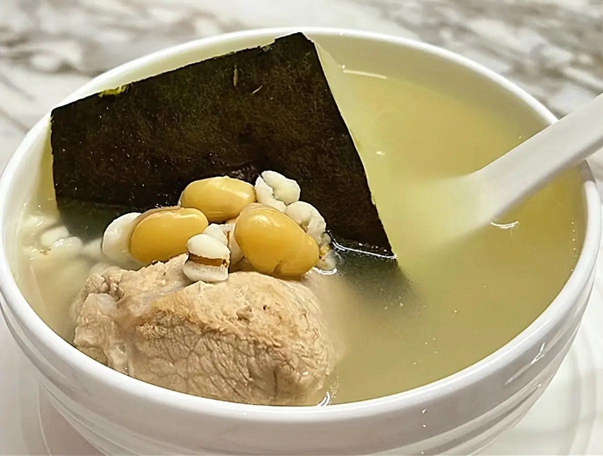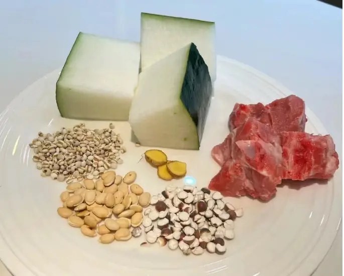 150g xương heo, một khúc bí đao, một nắm hạt đại mạch, một ít hạt gorgon, vài lát gừng, một nắm nhỏ đậu lăng trắng.