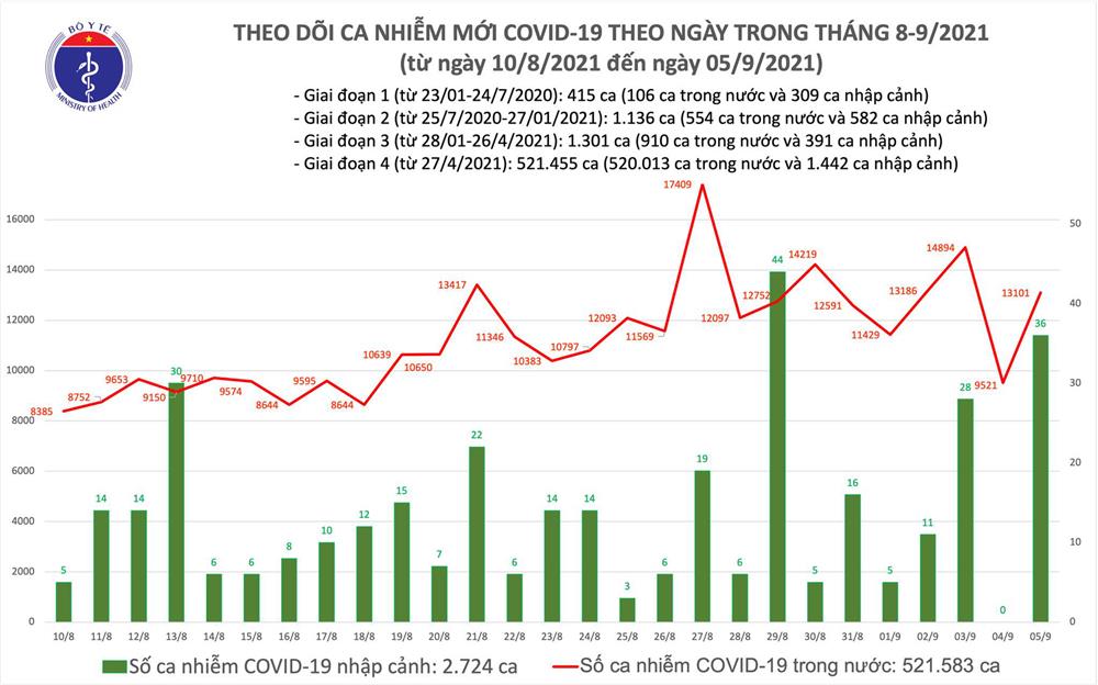 Ngày 5/9 của Bộ Y tế cho biết có 13.137 ca mắc COVID-19, cao hơn hôm qua 3.616 ca
