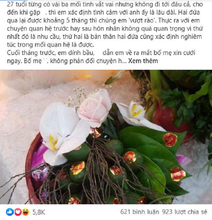 Câu chuyện của cô như sau: “27 tuổi từng có vài ba mối tình vắt vai nhưng không đi tới đâu cả, cho đến khi gặp V. thì em xác định tình cảm với anh ấy là lâu dài. Hai đứa qua lại được khoảng 5 tháng thì chúng em ‘vượt rào’. Thực ra với em chuyện quan hệ trước hay sau hôn nhân không quá quan trọng vì thứ nhất đó là nhu cầu, thứ hai là bản thân hai đứa cũng xác định nghiêm túc trong mối quan hệ là được.