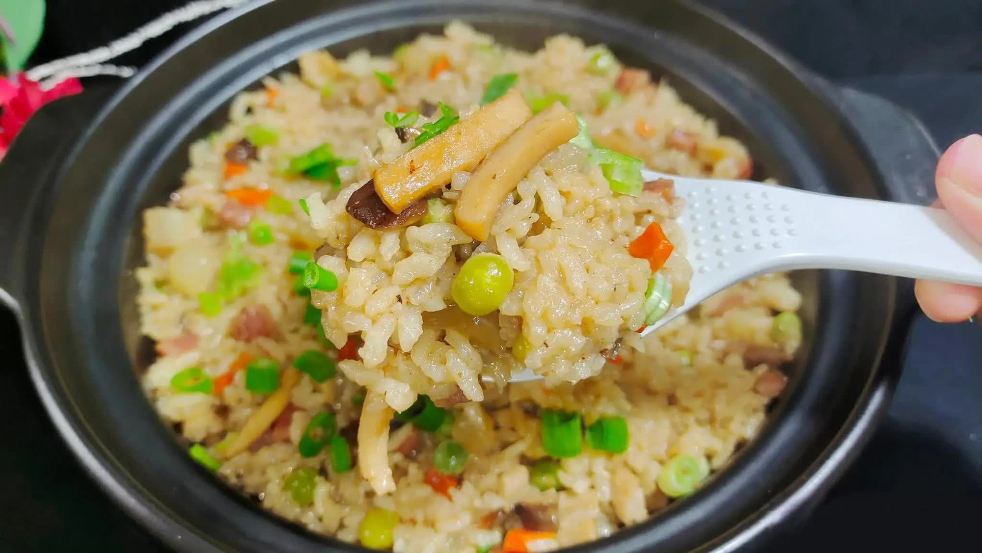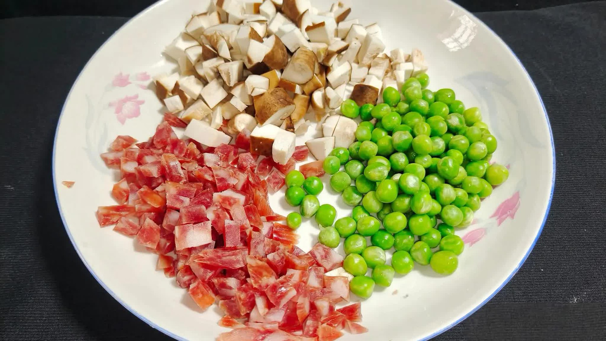 Bước 1: Gạo đem vo sạch rồi ngâm khoảng 15 phút và vớt ra, để ráo. Củ cải trắng gọt bỏ vỏ, rửa sạch rồi cắt thành khối vuông nhỏ. Đậu Hà Lan rửa sạch. Thịt ba chỉ xông khói và lạp xưởng bạn cắt thành miếng nhỏ hình hạt lựu. Nấm hương rửa sạch, thái khối giống củ cải. Với nấm hương bạn cũng có thể sử dụng loại nấm khô thay cho nấm tươi (Bạn rửa sạch nấm hương khô rồi ngâm trong nước ấm khoảng 15 phút rồi thái khối và tận dụng nước ngâm nấm để nấu cơm).