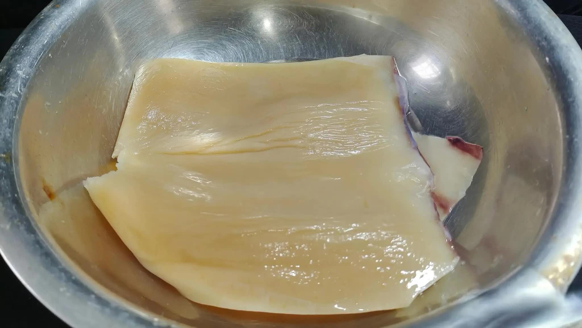 Bước 2: Trước đó bạn cho con mực khô vào ngâm trong nước ấm khoảng 2 tiếng. Tiếp theo bạn vớt ra chà sạch lớp màng phủ trên bề mặt con mực. Sau đó bạn cho vào nước ấm và ngâm qua đêm cho mực nở đều. Sau đó rửa sạch lại bằng nước ấm, chần qua một lần nước sôi rồi cắt thành từng sợi nhỏ.