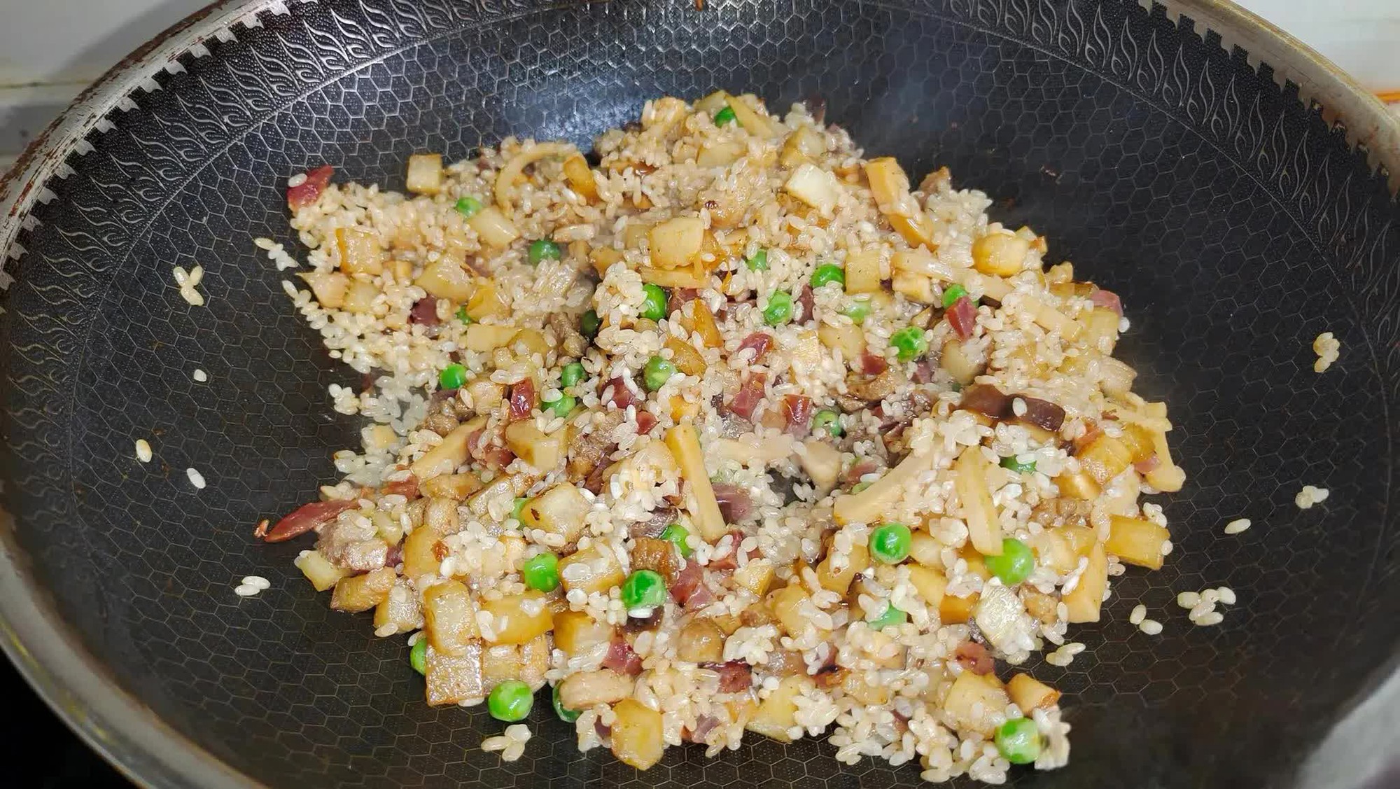 Bước 4: Kế tiếp, bạn cho củ cải và đậu Hà Lan vào chảo xào đều. Sau đó rưới thêm một lượng nước tương vừa ăn, đảo đều cho ngấm gia vị. Tiếp theo bạn cho gạo đã ngâm trước đó vào xào đều rồi thêm lượng nước sôi thích hợp. Lúc này bạn có thể nêm nếm thêm một chút hắc xì dầu để tạo màu và chút xíu muối cho vừa ăn.