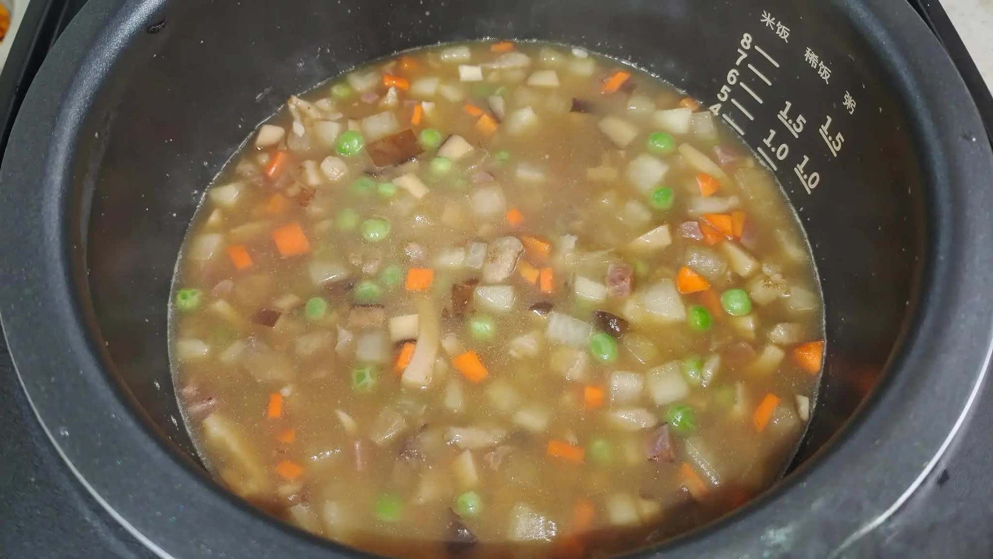 Bước 5: Tiếp theo bạn chuyển tất cả vào nồi cơm điện. Dùng muỗng khuấy nhẹ rồi đậy nắp, ấn nút nấu và chờ đợi món ăn chín. Sau khi cơm chín, bạn chỉ cần rắc một chút hành lá xắt nhỏ vào và trộn đều trước khi lấy ra ăn.