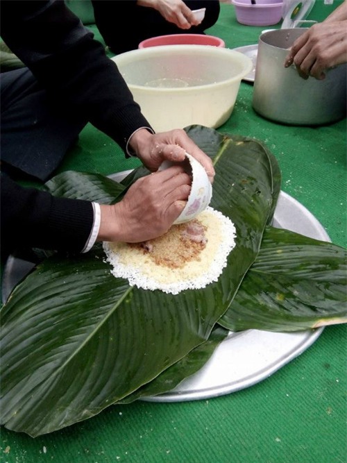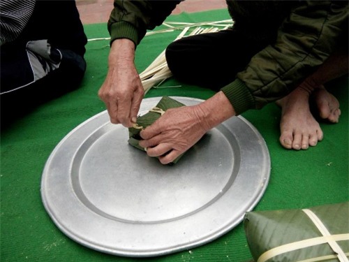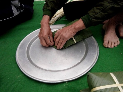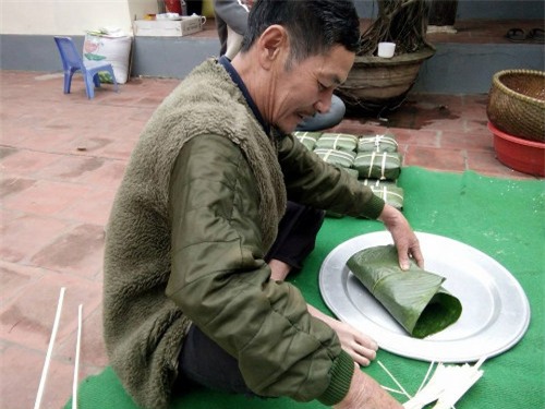Ngồi vào chiếu, ai nấy trong gia đình ông Liễu chuyên tâm vào công việc của mình. Người đong gạo nếp, người cân mật đường, người xếp lá dong và giã đậu đỗ,… Sau đó, anh con trai cả của ông sẽ đổ từng nguyên liệu lên mặt lá dong. Cuối cùng, ông Liễu bắt lá, buộc lạt. Đây chính là khâu quan trọng tạo nét riêng của “thương hiệu” bánh chưng mật làng Vân Canh vì bánh cần người có kinh nghiệm gói chặt, cao thành và vuông vắn.