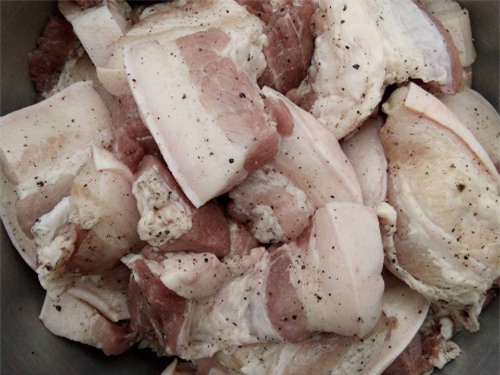 Thịt làm nhân bánh phải là thịt ba chỉ thớ dày, sạch và nhiều nạc. Sau đó, thịt ướp với nước mắm, hạt tiêu và bột ngọt