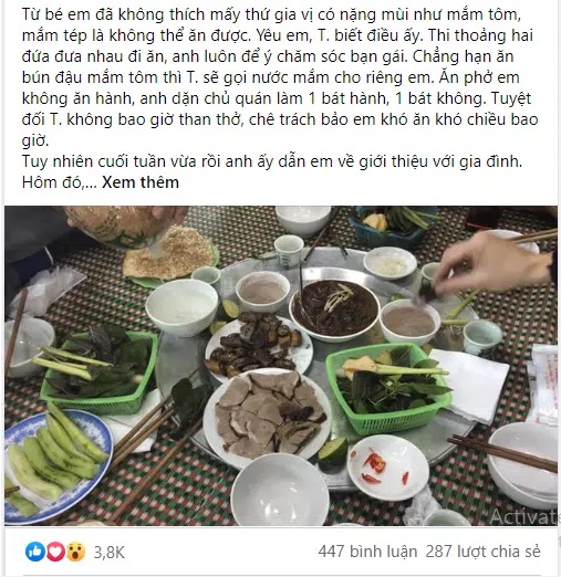 Câu chuyện của cô như sau: "Từ bé em đã không thích mấy thứ gia vị có nặng mùi như mắm tôm, mắm tép là không thể ăn được. Yêu em, T. biết điều ấy. Thi thoảng hai đứa đưa nhau đi ăn, anh luôn để ý chăm sóc bạn gái. Chẳng hạn ăn bún đậu mắm tôm thì T. sẽ gọi nước mắm cho riêng em. Ăn phở em không ăn hành, anh dặn chủ quán làm 1 bát hành, 1 bát không. Tuyệt đối T. không bao giờ than thở, chê trách bảo em khó ăn khó chiều bao giờ.