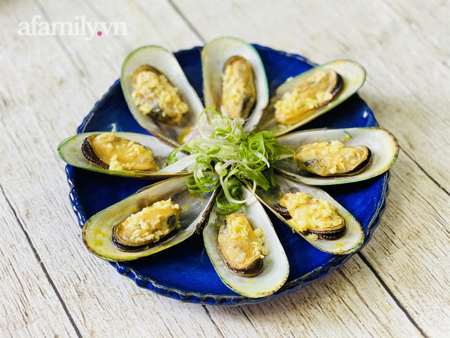 Nguyên liệu: 1/2 kg vẹm Newzealand, 15g tỏi, 30g bơ mặn, hành lá (để trang trí)
