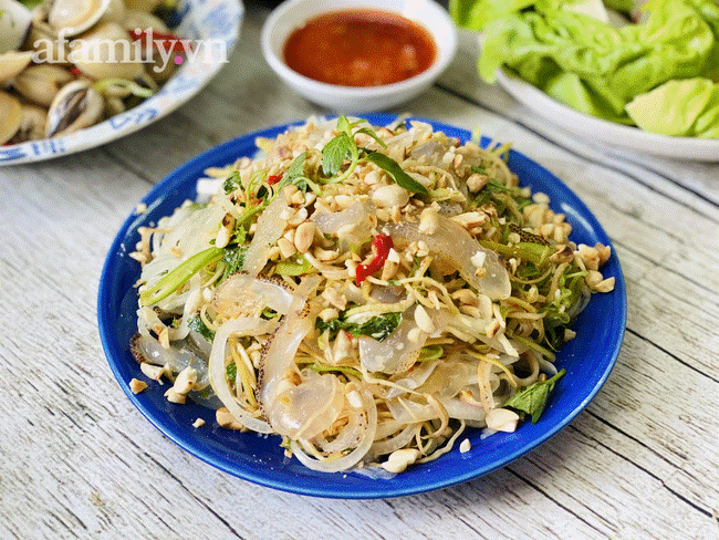 Nguyên liệu: 1/2kg sứa, 100g bắp chuối hột, 50g rau muống chẻ, 100g đậu phộng rang, 1 củ hành tây, 1 chén nước mắm tỏi ớt, 1 trái chanh tươi, rau mùi thơm: tía tô, rau thơm, lá é quế, ngò gai.