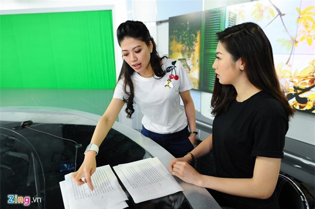 Kết thúc Chuyển động 24h, cô tranh thủ trao đổi lại nghiệp vụ với đàn em Trúc Mai.