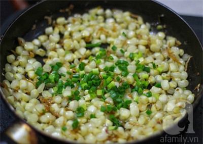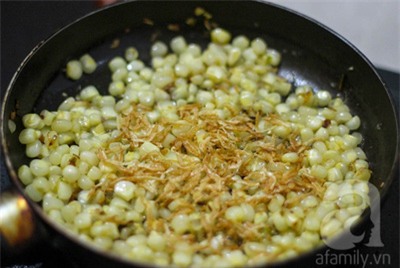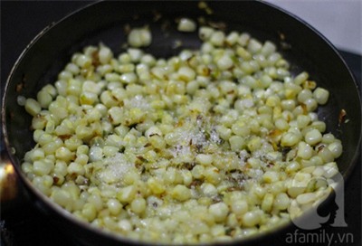 ![]() | ![]() Tiếp theo, bạn cho ngô vào chảo đảo đều. |