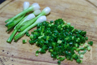 ![]() | ![]() Hành lá rửa sạch, cắt phần củ để riêng, phần lá thái nhỏ. |