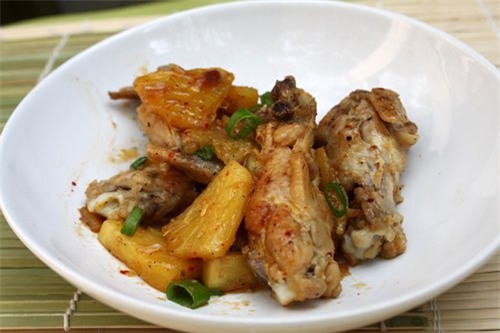 - Tiếp theo thêm dứa, một thìa nhỏ nước mắm, nửa thìa nhỏ hạt nêm, nửa thìa nhỏ muối, xíu ớt bột. Đậy kín nắp nồi, đun lửa nhỏ. Nêm nêm lại tùy theo khẩu vị và tùy theo độ chua, ngọt của dứa.