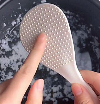 Lúc này, những chấm tròn li ti trên muôi xúc cơm này sẽ bắt đầu phát huy tác dụng của mình. Bạn hãy đổ nước vào nồi cho cơm mềm ra, sau đó dùng mặt có các chấm tròn và cọ xát nhẹ nhàng vào các hạt cơm bám trên thành nồi.