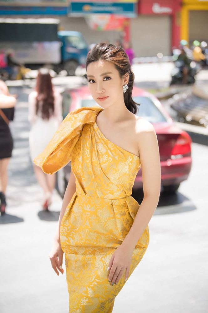 Mặc chiếc đầm vàng rực rỡ lệch vai khoe bờ vai trần thon thả, Hoa hậu Đỗ Mỹ Linh nổi bật trên ghế giám khảo vòng sơ khảo cuộc thi Hoa hậu Việt Nam 2018.