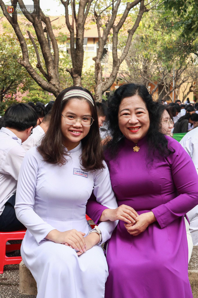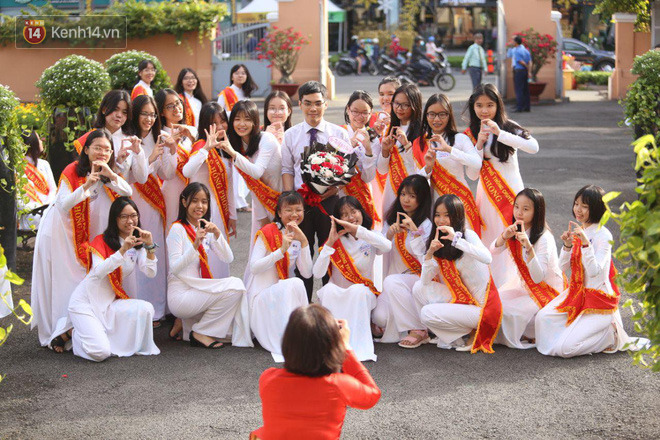 Học sinh trường THPT Nguyễn Thị Minh Khai chụp ảnh cùng cô giáo