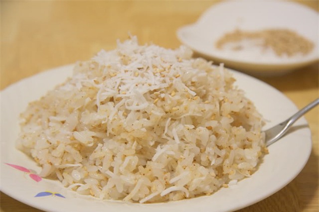 - Sau đó, đổ xôi ra một cái khay lớn. Dùng đũa trộn đều dừa lẫn vào với xôi và để xôi nguội đến khi không còn thấy khói bốc lên nữa. Cho vừng vào trộn đều.