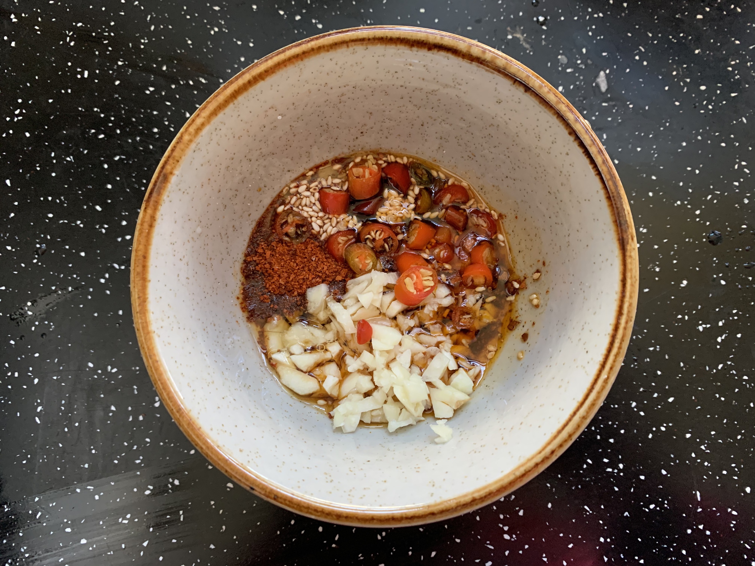 Bước 3: Cho xì dầu, dầu hào, ớt cay xắt miếng nhỏ, tỏi băm, đường, ớt bột, vừng rang, giấm balsamic, muối vào bát và trộn đều. Bạn có thể thêm một chút dầu ớt (còn gọi là dầu cay) nếu thích. Tiếp theo bạn đun 2 thìa canh dầu ăn cho nóng rồi đổ vào bát sốt vừa trộn.
