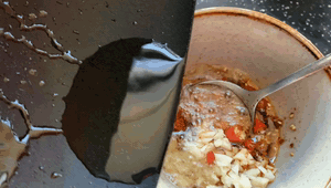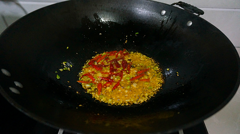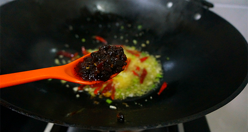 Bước 5: Bây giờ chúng ta cùng xào các nguyên liệu gia vị cho phần sốt. Bạn cho một ít dầu ăn vào chảo, thêm gừng băm, tỏi, hành lá vào rồi xào thơm. Nếu thích ăn cay, bạn có thể cho ớt hoặc ớt khô vào, còn nếu không thì hãy bỏ qua bước này. Tiếp theo cho sốt đậu đen vào xào trên lửa nhỏ cho đến khi dậy mùi thơm.