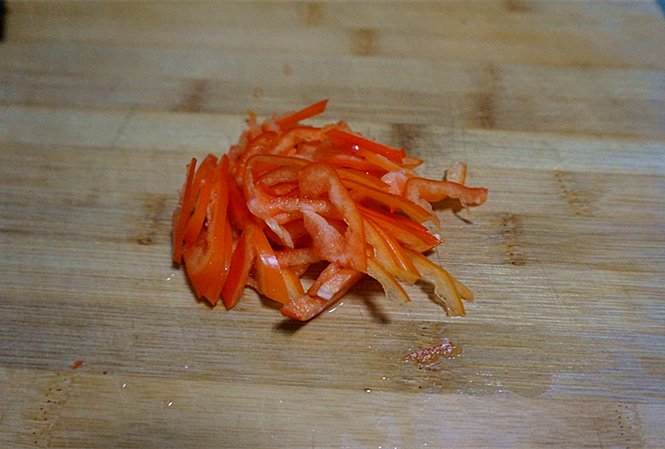 Bước 3: Sự kết hợp màu sắc của các món gỏi luôn rất quan trọng. Do đó bạn có thể chọn ớt chuông/ ớt ngọt màu đỏ hoặc cà rốt cho món ăn này và xắt thành miếng nhỏ, để riêng sang một bên. Khi tai heo đã luộc chín, bạn vớt ra và ngay lập tức thả vào tô nước đá.