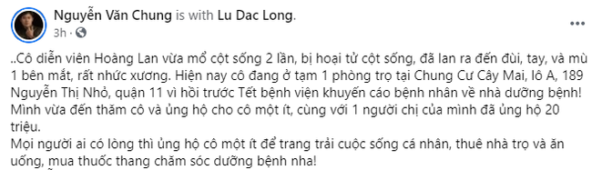 Cụ thể, trên trang cá nhân, nhạc sĩ Nguyễn Văn Chung viết: "Cô diễn viên Hoàng Lan vừa mổ cột sống 2 lần, bị hoại tử cột sống, đã lan ra đến đùi, tay và mù một bên mắt, rất nhức xương.