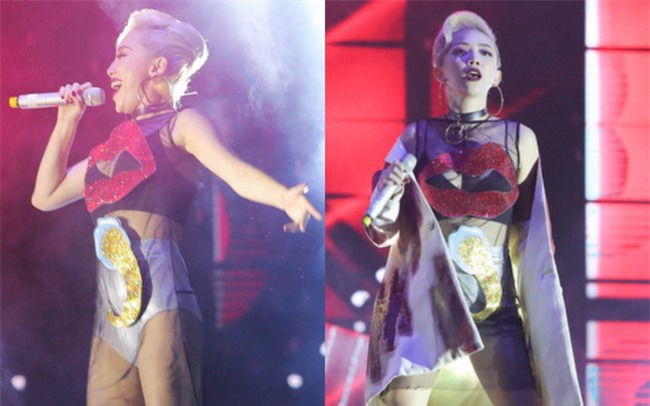 Điển hình như trong một đêm nhạc tối 18/12 vừa qua, Tóc Tiên gây "sốc" khi diện trang phục sexy táo bạo với bra-top kết hợp quần chẽn. Điều đáng nói là họa tiết hình chiếc lưỡi được đính trên tấm áo choàng mỏng bên ngoài đặt ở vị trí khá nhạy cảm đó là phần bụng. Khi được hỏi về chi tiết này, nữ ca sĩ chỉ cho biết là trang phục này do stylist chọn và bản thân cô thực sự không để ý đến vị trí của họa tiết này khi xem qua bộ đồ.