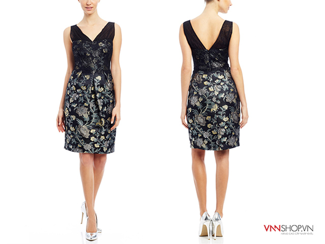 Váy Kay Unger thiết kế sang trọng họa tiết in hoa thân váy sắc nét, giả cúp ngực cổ pha ren đen tinh tế, lưng xẻ chữ V sâu gợi cảm