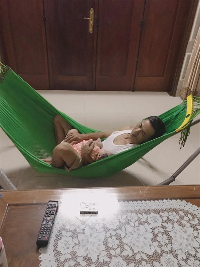 Bố chăm sóc em từ nhỏ, một mình bố vừa là bố vừa là mẹ vừa là bạn, nên ông nhìn mình chăm cháu của ông, ông cứ suýt xoa như kiểu hai đứa trẻ ranh chăm nhau, rồi ông lại giành bế ẵm, lại nịnh ngọt nó. Em bế con đi lên cầu thang mà ông cũng dặn cẩn thận rơi cháu. Ông chăm cháu khéo lắm, từ cái bỉm cái tã tới miếng ăn. Tự nhiên cảm giác nhớ lại hồi bé, một tay ông nuôi nấng con mẹ, giờ lại đến lượt con con.