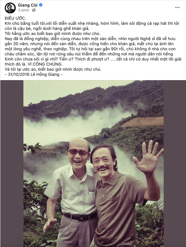 Theo đó, vào thời điểm NS Phạm Bằng qua đời (31/10/2016), NS Giang Còi đăng tải trên trang cá nhân những lời tiễn biệt đầy xúc động: "Khi chú bằng tuổi tôi, với lối diễn xuất nhẹ nhàng, hóm hỉnh, làm sôi động cả rạp hát thì tôi còn là cậu bé, ngồi dưới hàng ghế khán giả. Tôi hằng ước ao biết bao giờ mình được như chú.