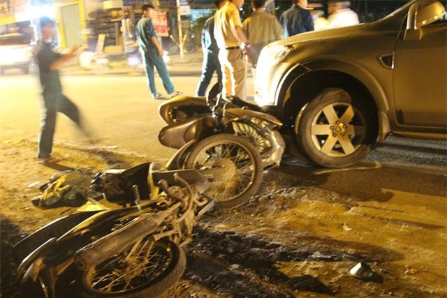 Tại hiện trường, 4 chiếc xe máy bị hư hỏng nặng nằm la liệt, trong đó có một chiếc xe máy lọt dưới gầm trước ô tô; trên kính chắn gió chiếc ô tô gây tai nạn có mảnh giấy mang logo của ngành công an với thông tin diễn tập phương án phòng chống thiên tai, tìm kiếm cứu nạn.