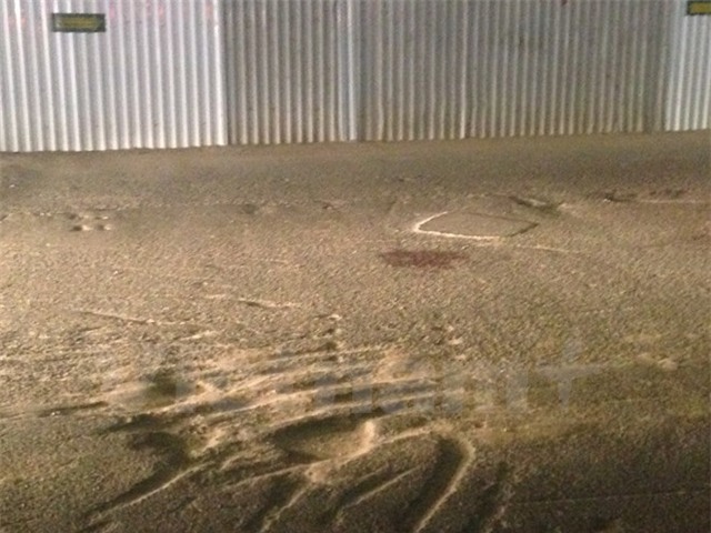 còn vệt máu. Phía trên, nhiều công nhân vẫn đang soi đèn xuống.