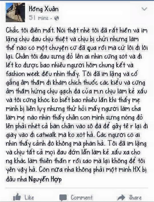 "Tôi đã im lặng và chịu tất cả mọi đau đớn lẫn làm kẻ xấu xa cho người khác làm thiên thần rồi mà sao không để tôi yên vậy hả. Còn nữa nha, không phải một mình HX (Hồng Xuân) bị đâu nha", người mẫu nói và đánh dấu trang cá nhân của Nguyễn Hợp vào cuối trạng thái này.
