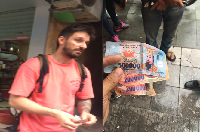 Sau chuyến đi, 2 du khách trả người lái xích lô 1,5 triệu đồng và nhận lại tiền thừa là 900 nghìn đồng tiền âm phủ (bao gồm 1 tờ 500 nghìn đồng và 2 tờ 200 nghìn đồng).