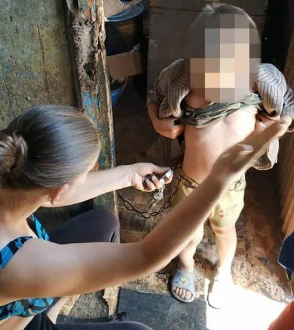 Khi tới nơi, tất cả mọi người đã bị sốc nặng trước cảnh tượng một bé trai 6 tuổi đang bị bố mẹ xích như động vật trước cửa nhà. Cậu bé bị buộc một sợi xích to quanh người, sau đó phải quỳ trên nền đất nứt nẻ và bẩn thỉu, giơ hai tay lên trời để chịu phạt. Đầu kia của sợi xích bị khóa vào cửa nhà khiến cậu bé không thể di chuyển hay chạy trốn được.