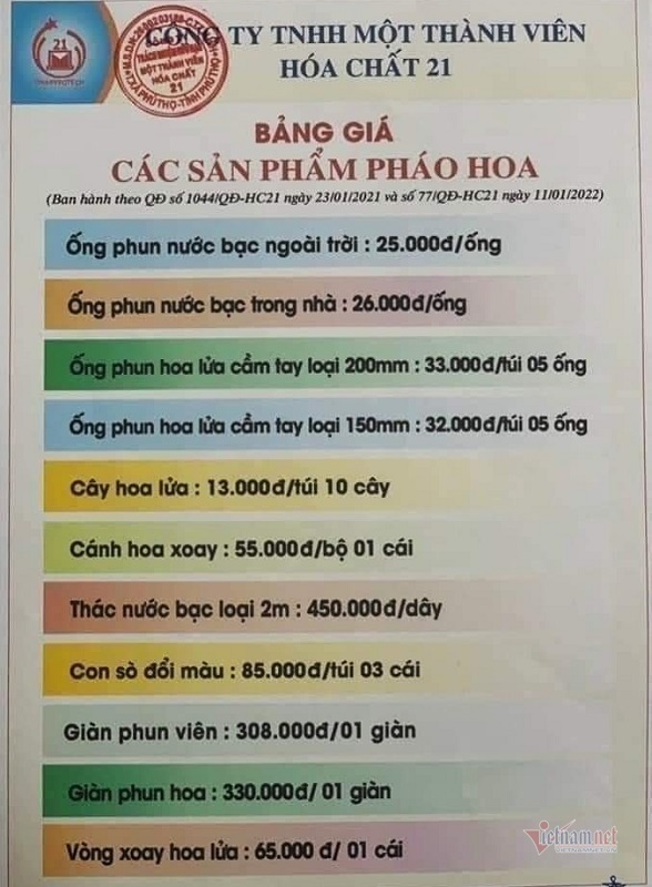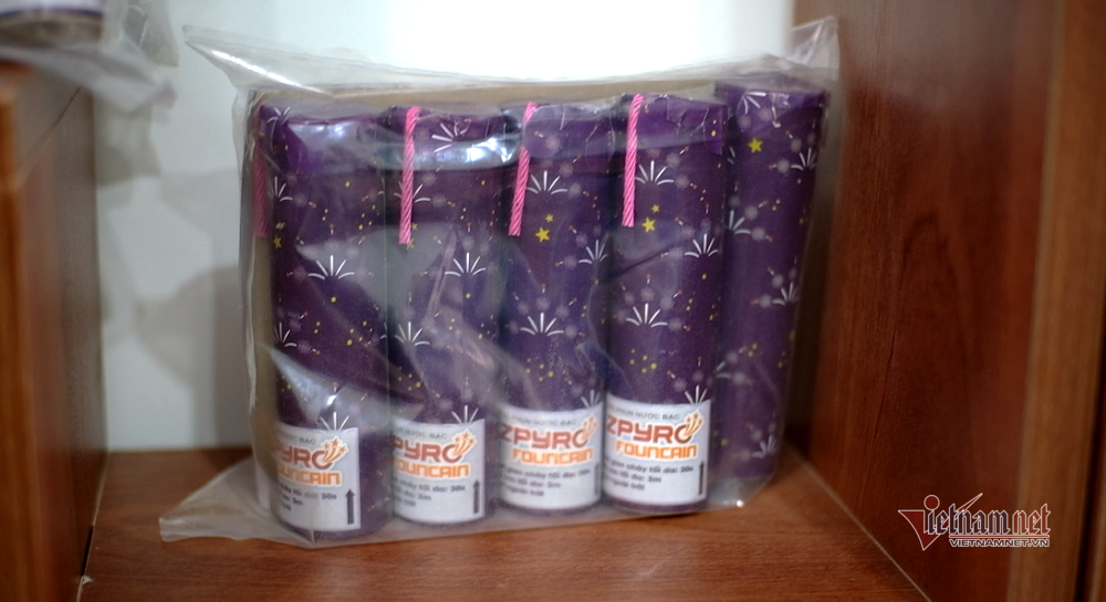 Theo chị Phượng, sản phẩm mà Nhà máy Z121 (Bộ Quốc phòng) sản xuất trong năm nay, được phép sử dụng đó là giàn pháo phun viên. Một giàn phun viên sẽ có 25 ống, tầm cao phụt ánh sáng từ 25-30m và có giá 308.000 đồng.