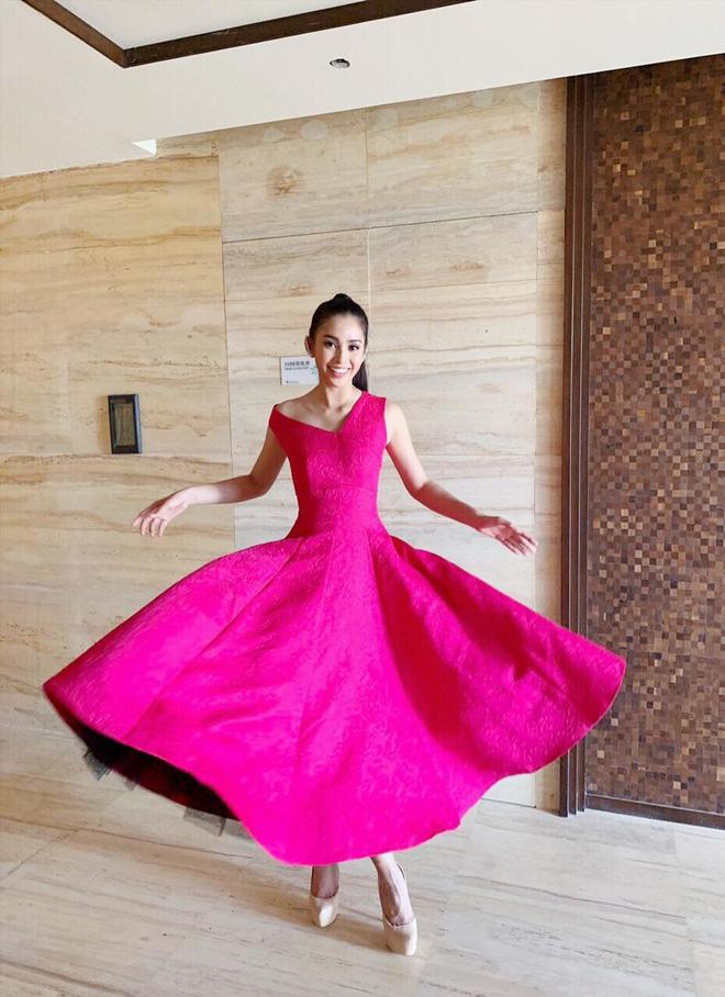 Trước đó, trong buổi thử đồ chuẩn bị trước khi lên đường, Tiểu Vy còn cho thấy mình là một "tín đồ" của sắc màu này. Mặc dù nhiều ý kiến cho rằng đây là gam màu khó mặc và sến súa, dễ "dìm hàng" người khác nhưng đối với riêng Tiểu Vy, nhan sắc của cô nàng lại thêm phần thăng hoa.