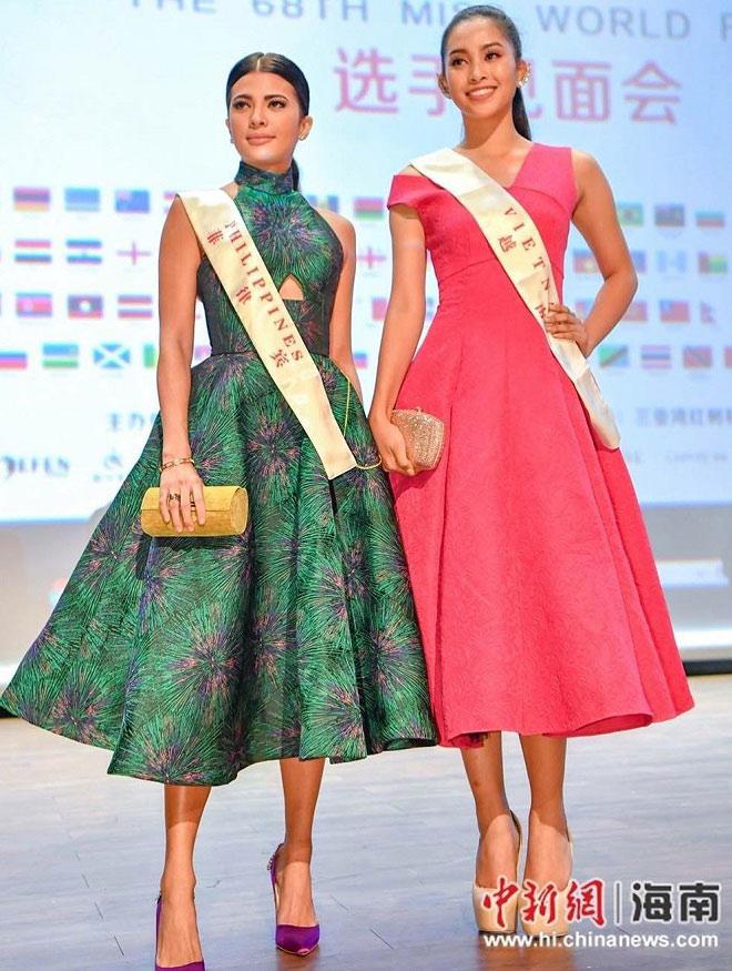 Trước đối thủ Philippines, Tiểu Vy chẳng hề lép vế với tông hồng rực rỡ. Được biết, cô nàng hầu như lựa chọn tông màu này tại hầu hết các sự kiện diễn ra trong khuôn khổ cuộc thi vì đây là màu sắc được cho là may mắn, làm nên tên tuổi của đại diện Việt Nam tại đấu trường này.