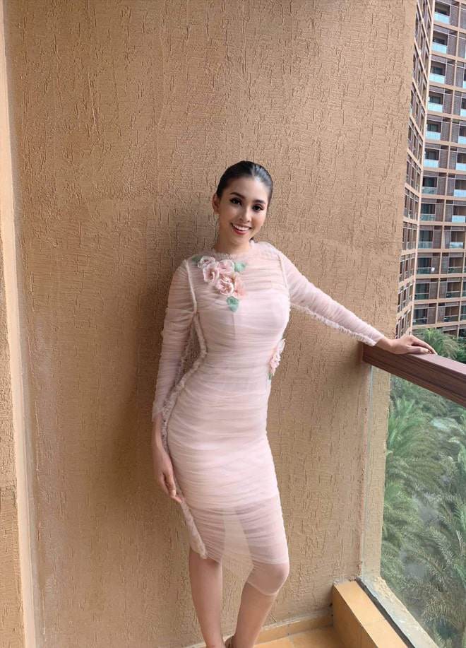 Tiếp tục là một bộ cánh màu hồng có thiết kế ôm sát giúp tôn lên 3 vòng "chuẩn chỉnh" của người đẹp Quảng Nam. Đi kem với mẫu đầm có vẻ khá rườm rà, Tiểu Vy chọn cho mình kiểu tóc buộc cao đơn giản để làm cho cả tổng thể trở nên thanh lịch mà không kém phần ấn tượng.