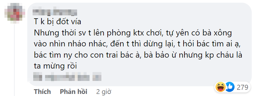 Một tài khoản chia sẻ tình huống vô cùng bi hài của mình: “Tớ thì không bị đốt vía. Nhưng thời sinh viên, tớ lên phòng ký túc xá chơi, tự nhiên có một bác xông vào nhìn nháo nhác, đến tớ thì dừng lại. Tớ hỏi: “Bác tìm ai ạ? Bác tìm người yêu cho con bác à?” Bác bảo: “Ừ, nhưng không phải cháu là mừng rồi”.
