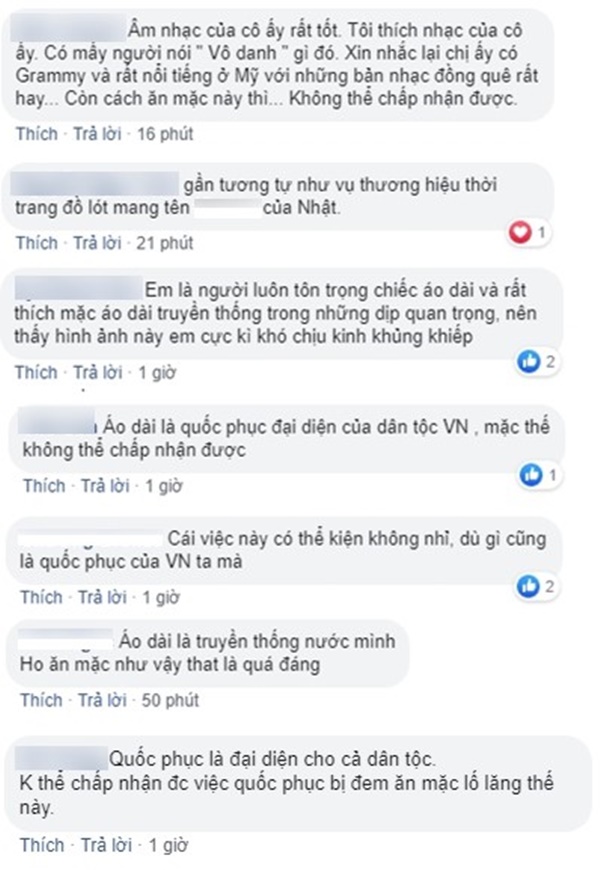 "Âm nhạc của cô ấy rất hay, từng đoạt giải Grammy và rất nổi tiếng ở Mỹ với những bản đồng quê. Tuy nhiên cách ăn mặc như thế này là không thể chấp nhận được", "Thật sự khá bức xúc trước hành động này của Kacey Musgraves", "Áo dài là quốc phục của Việt Nam làm thế này là không thể chấp nhận được", "Quốc phục là đại diện cho cả một dân tộc, làm thế này là không tôn trọng người Việt Nam", "Thật sự rất quá đáng luôn đấy". - Cư dân mạng thể hiện sự bức xúc trước việc ăn mặc phản cảm của Kacey Musgraves bên dưới bài đăng của Ngô Thanh Vân.