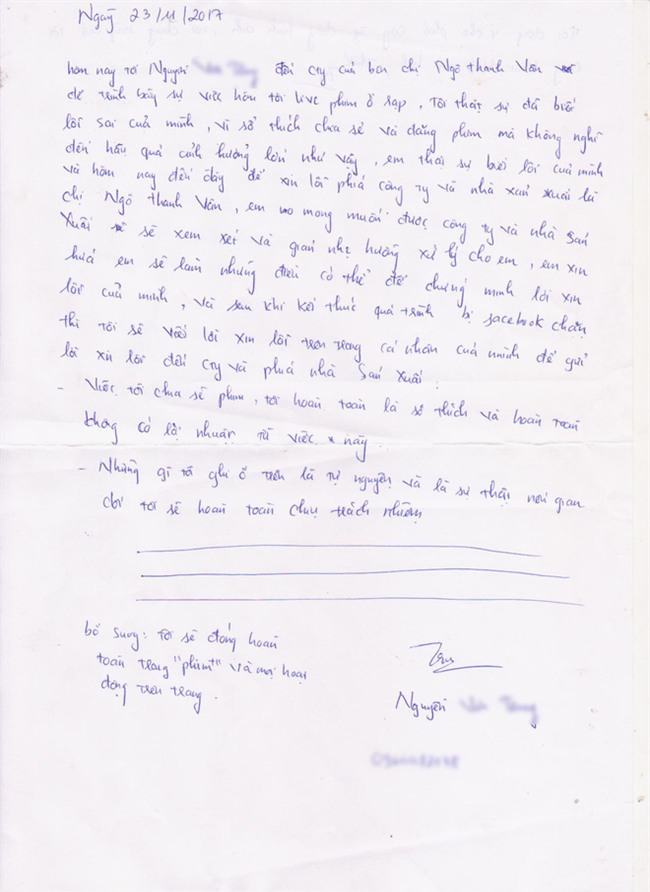 Theo đó, anh Tr. đã thừa nhận hành vi vi phạm của bản thân, cụ thể là quay lén (livestream) trong rạp phim bằng văn bản viết tay. Không những thế, Tr. tường thuật rõ ràng về sự việc xảy ra ngày hôm đó bằng đoạn ghi âm.