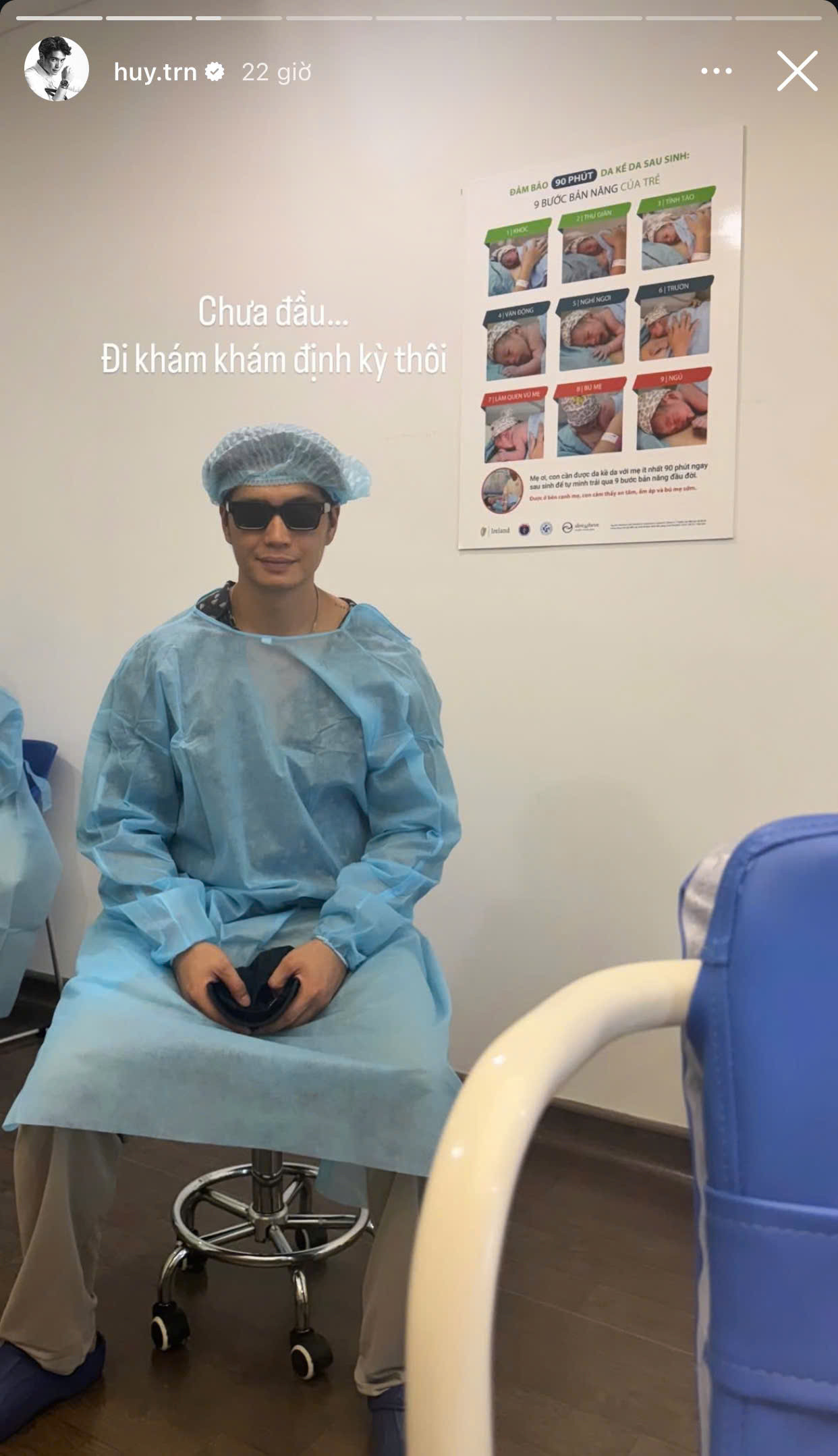 Mới đây, Huy Trần - ông xã Ngô Thanh Vân gây chú ý khi đăng khoảnh khắc ngồi tại một cơ sở y tế. Đáng chú ý, anh mặc đồ phòng mổ màu xanh, đeo kính đen, phía sau là bảng hướng dẫn chăm sóc trẻ sơ sinh.