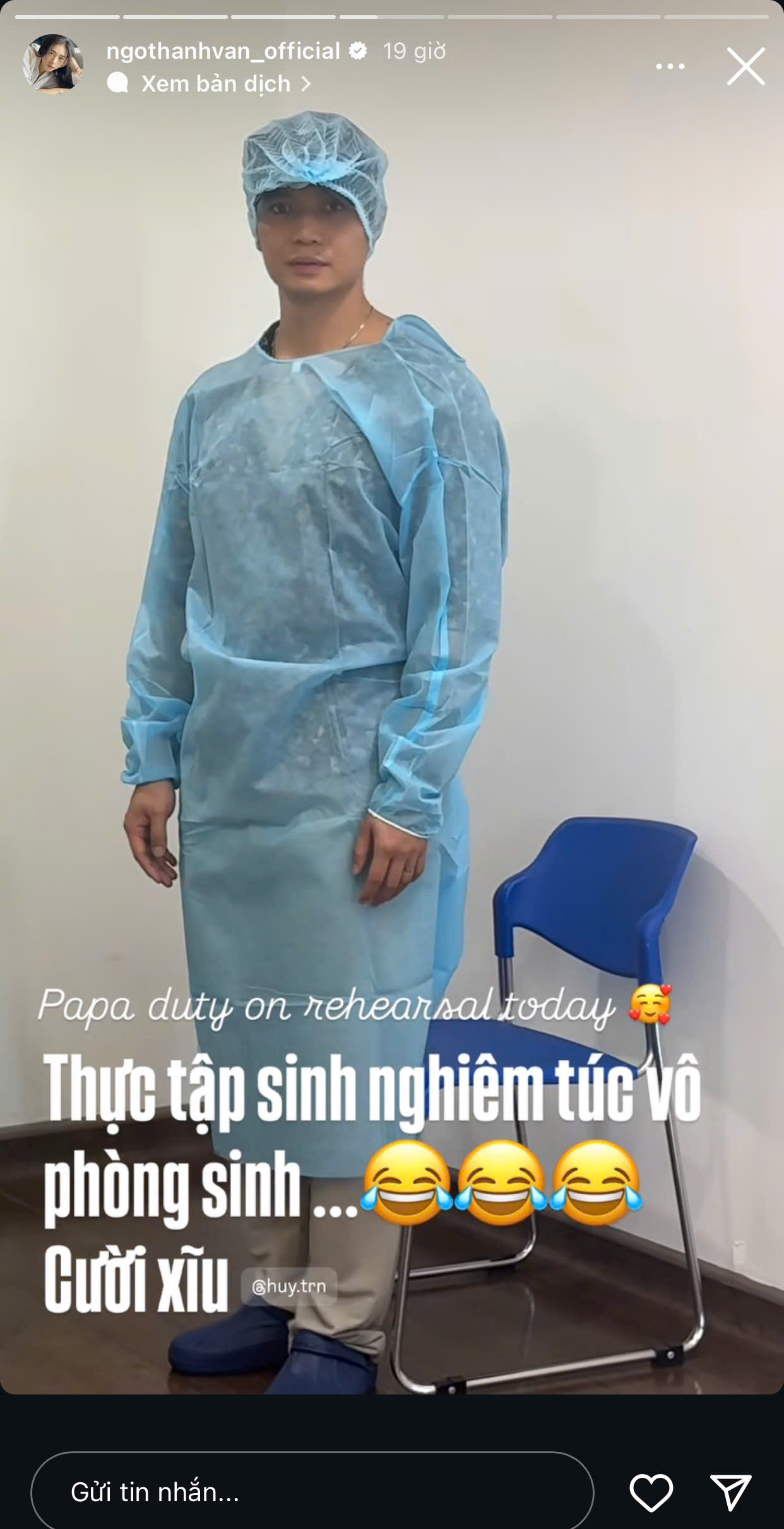 Ở phía Ngô Thanh Vân, người đẹp cũng đăng tải khoảnh khắc hài hước của ông xã trong bộ đồ bảo hộ. Cô còn không quên chọc ghẹo ông xã: "Thực tập sinh nghiêm túc vô phòng sinh. Cười xỉu".