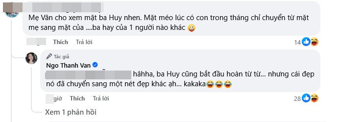 Dưới bài đăng, cư dân mạng cũng quan tâm đến diện mạo của Huy Trần hiện tại. Ngô Thanh Vân cũng nhanh chóng lên tiếng cho biết ba Huy cũng bắt đầu hoàn từ từ nhưng cái đẹp đã chuyển sang một nét đẹp khác.