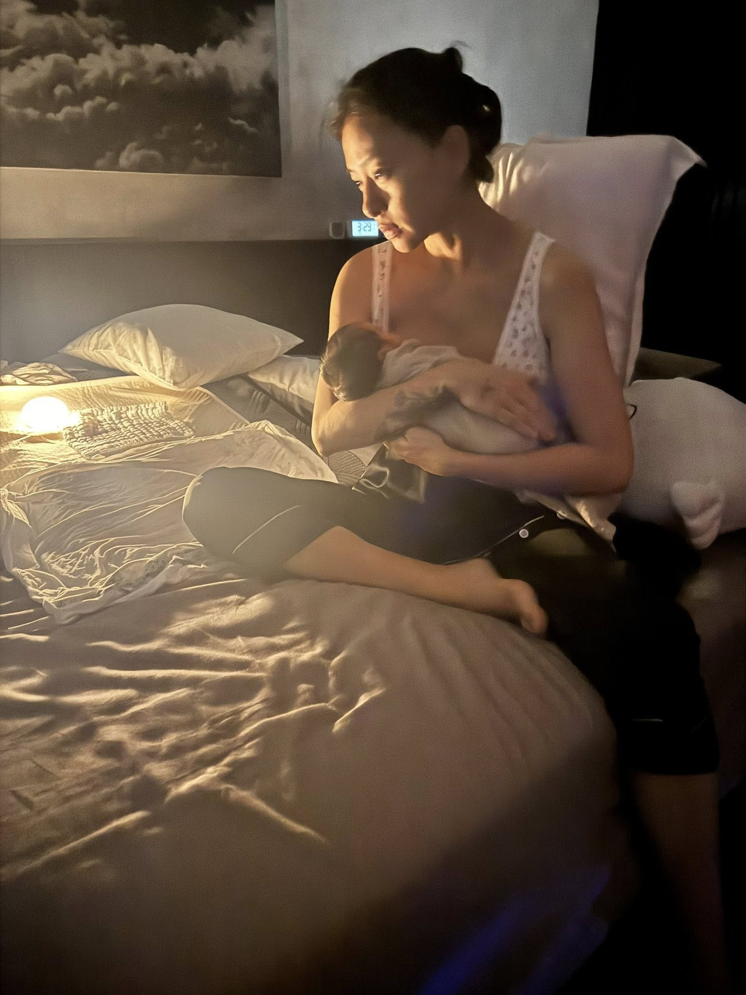Nữ diễn viên viết: "Ngày xưa, trước khi đi ngủ mình còn bôi hết kem dưỡng này đến kem dưỡng nọ. Còn bây giờ nhiều khi cái mặt cả ngày chưa rửa, răng chưa kịp đánh. Ngày xưa đi ngủ là phải đầm lụa các kiểu, còn giờ áo ướt mèm sữa nhiều khi ngủ luôn. Xưa hai đứa ôm nhau ngủ, giờ có cục 3 kg chính giữa. Nửa đêm mà tiếng khóc vang lên, đứa lo bình sữa, đứa mắt nhắm mắt mở lia lịa cái tay với miếng tã”.