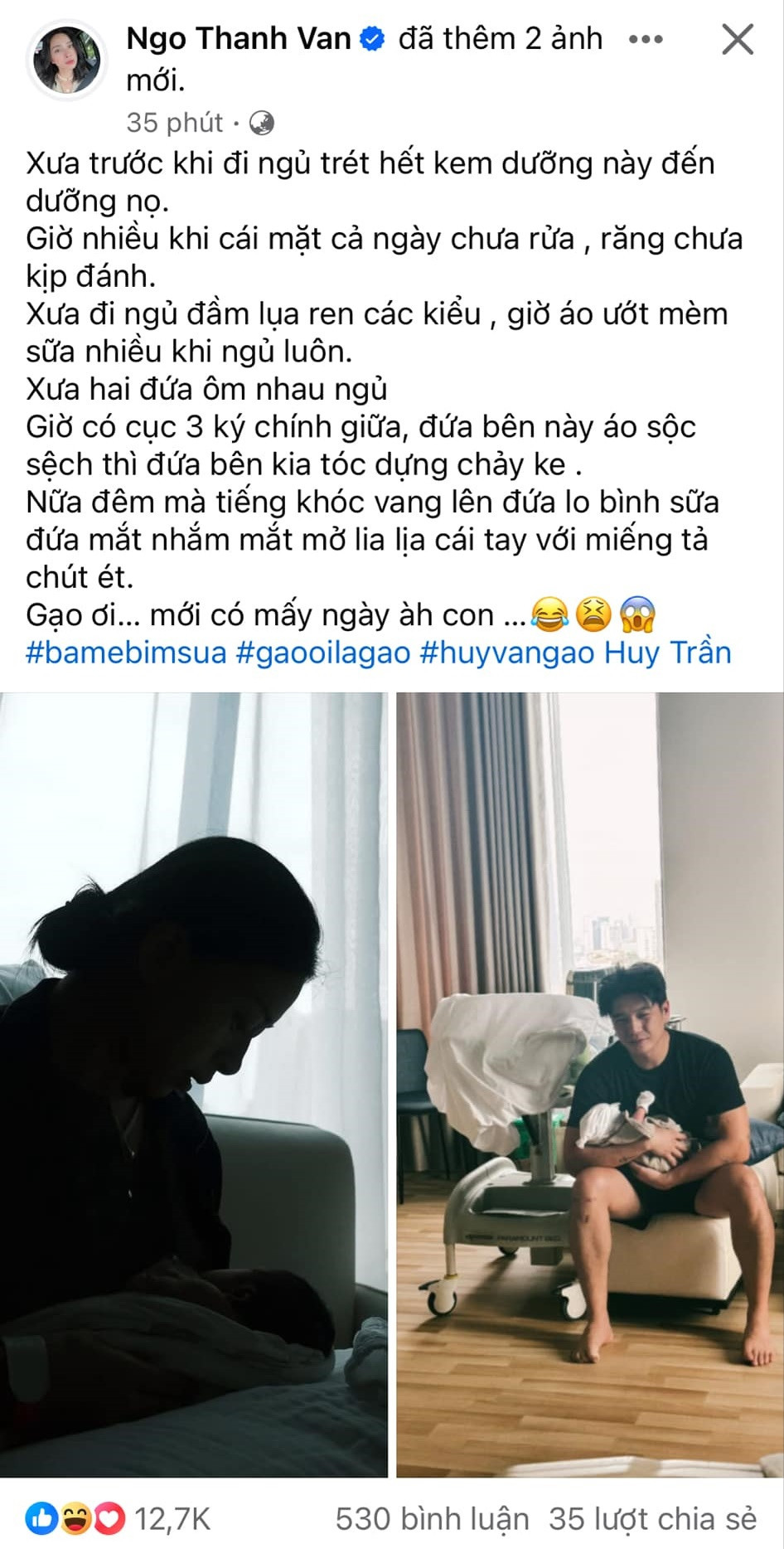 Sau 1 tuần đầu tiên chăm con vất vả, ông xã Huy Trần tự công khai hình ảnh "bỉm sữa" của mình trên trang cá nhân kèm dòng trạng thái: "Sống sót qua tuần đầu mất ngủ. Có hơi mệt, hơi xấu tí, nhưng tim thì đầy ắp yêu thương, lại còn sụt được mấy kí nữa chứ."